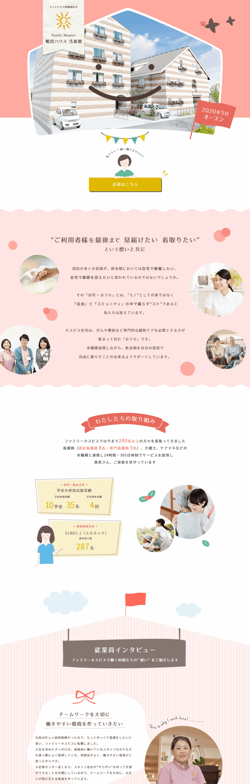 人生の最期のときを過ごす場所 カイロスアンドカンパニー様のシェアハウス型ファミリーホスピスの求人サイトを制作しました。 人生の最期のときを過ごすおうちになるホスピス住宅。 イラストを多用した可愛いデザインがご希望でしたので、オリジナルでイラストを作成し、 またキービジュアルでは瞬きをしたり旗が揺れたりなど、ポップな動きのあるサイトになりました。
